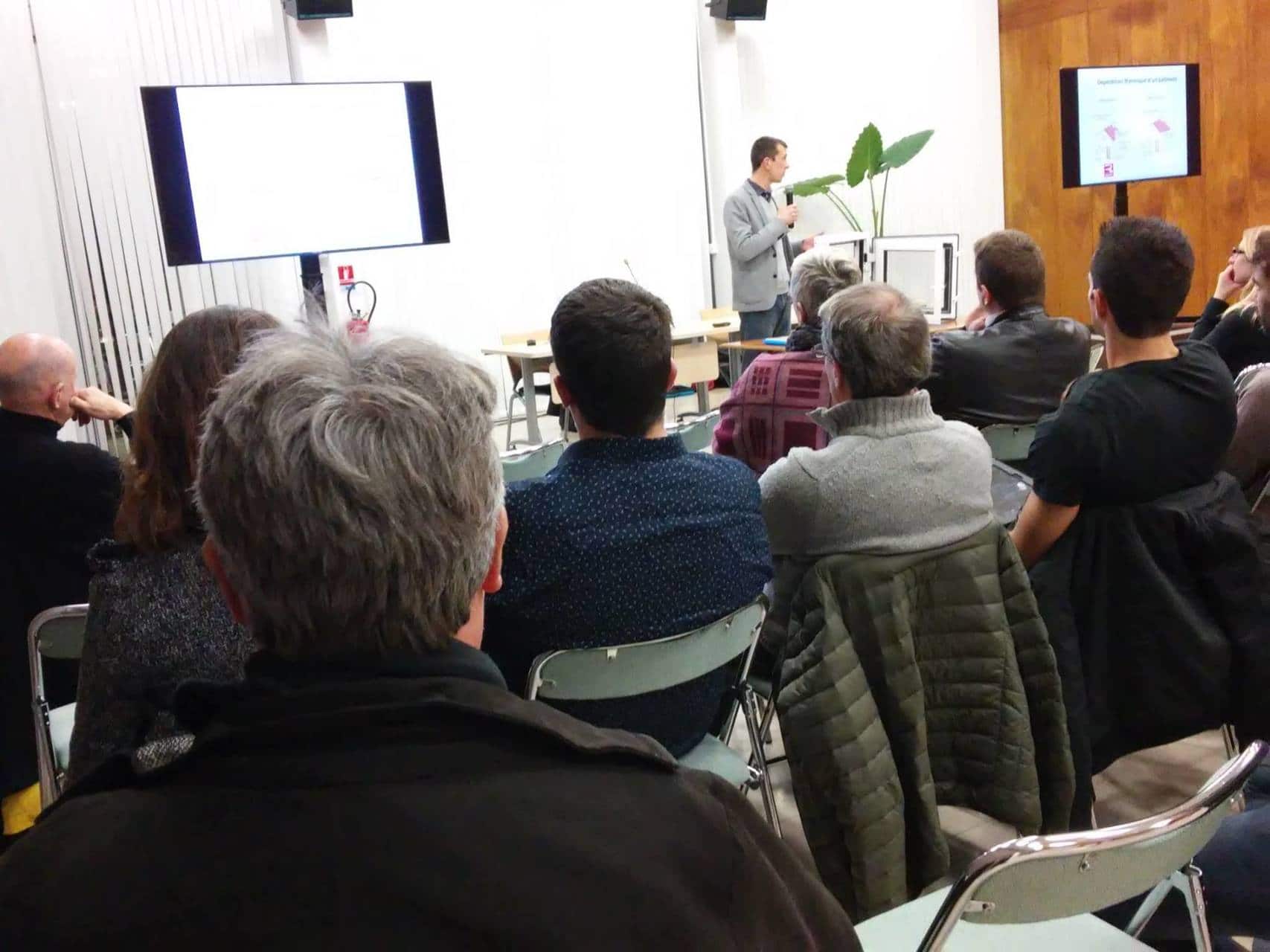 Après une présentation de fenêtres pariéto-dynamiques par l’entreprise TIQTAQ, l’intervention de l’architecte Jean-Luc Collet a grandement suscité le débat et la réflexion sur les enjeux et la mise en œuvre de la ventilation hygiénique.